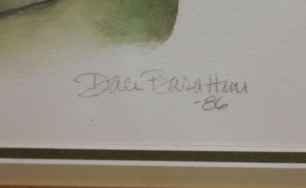 Watercolor painting "Dragonfly Near a Water Lily", green tones. Artist signed Dale Barattini, 1986. Framed 19"h x 22 1/2"w. Watercolor painting "Dragonfly Near a Water Lily", green tones. Artist signed Dale Barattini, 1986. Framed 19"h x 22 1/2"w.