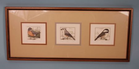 Three limited edition prints of birds. Robin 206/250, Titmouse 92/300, Chickadee 91/300. Artist L. DuBose, all framed together 11 1/2"h x 26 1/2"w. Three limited edition prints of birds. Robin 206/250, Titmouse 92/300, Chickadee 91/300. Artist L. DuBose, all framed together 11 1/2"h x 26 1/2"w.