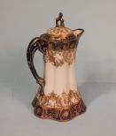 Nippon Gold Gilt Chocolate Pot; unmarked cream color background with cobalt border and handle. 9 1/2" h., 6 1/4" w. Nippon Gold Gilt Chocolate Pot; unmarked cream color background with cobalt border and handle. 9 1/2" h., 6 1/4" w.
