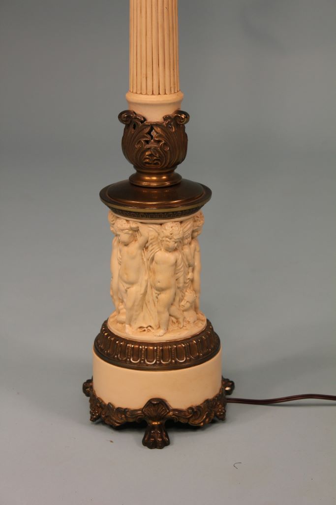 Vintage Metal Lamp, cream color vintage metal lamp with classical children, brass mounts, 41" h. Vintage Metal Lamp, cream color vintage metal lamp with classical children, brass mounts, 41" h.