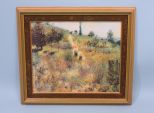 Oil on canvas painting "Sunday Stroll", yellow and green tones, not artist signed. 20 1/2"h x 22 1/2"w. Oil on canvas painting "Sunday Stroll", yellow and green tones, not artist signed. 20 1/2"h x 22 1/2"w.