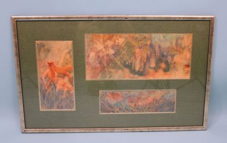 Group of three abstract watercolors, one of nude, orange and green tones. All framed together in silver tone frame. Not artist signed. Framed. 33" w x 21" h. Group of three abstract watercolors, one of nude, orange and green tones. All framed together in silver tone frame. Not artist signed. Framed. 33" w x 21" h.