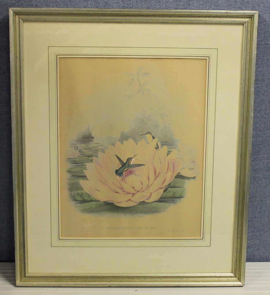 Chlorostilbon Portmanni Print, copy print of "Family of Hummingbirds" originally drawn by J. Gould, in an attractive silver frame. 20" w., 23" h. Chlorostilbon Portmanni Print, copy print of "Family of Hummingbirds" originally drawn by J. Gould, in an attractive silver frame. 20" w., 23" h.