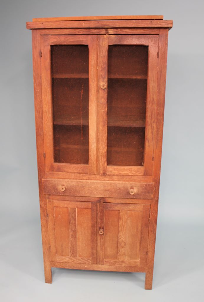 Early Oak Pie Safe; this pie safe is rare and unusual in that it folds up to a flat cabinet, shelves hold it in place when open, mesh in each door, over drawer and two more doors, 30 1/2" w., 16' d., 70" h. Early Oak Pie Safe; this pie safe is rare and unusual in that it folds up to a flat cabinet, shelves hold it in place when open, mesh in each door, over drawer and two more doors, 30 1/2" w., 16' d., 70" h.