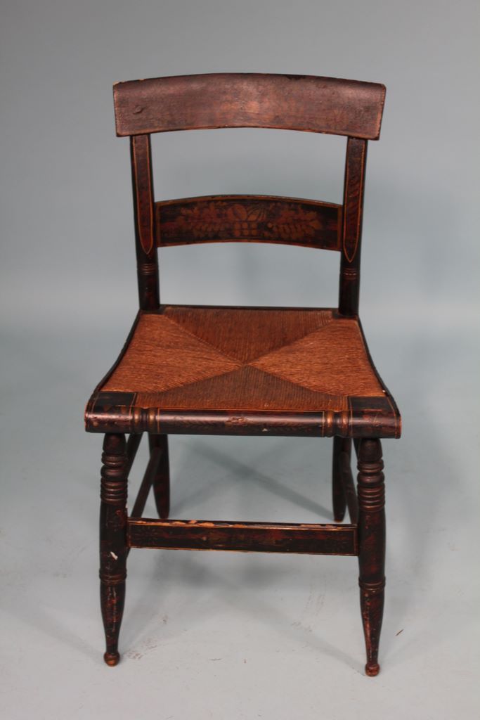 Early Stenciled Side Chair, early 1800's black stenciled (Hitchcock) Original cane in seat and stencil work, 33" h. x 17" w. Early Stenciled Side Chair, early 1800's black stenciled (Hitchcock) Original cane in seat and stencil work, 33" h. x 17" w.