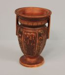 Roseville Pottery Vase brown background, four divided panels, separated by floral leaf design. Florentine I pattern. Stamped black circa 1914-1930, 6" h., 4" dia. Roseville Pottery Vase brown background, four divided panels, separated by floral leaf design. Florentine I pattern. Stamped black circa 1914-1930, 6" h., 4" dia.