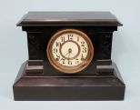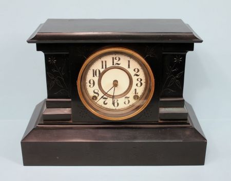 Late 19th Century black slate mantel clock. Aesthetic movement period slate clock, has key. 10 1/2"h x 14 1/4"w. Late 19th Century black slate mantel clock. Aesthetic movement period slate clock, has key. 10 1/2"h x 14 1/4"w.