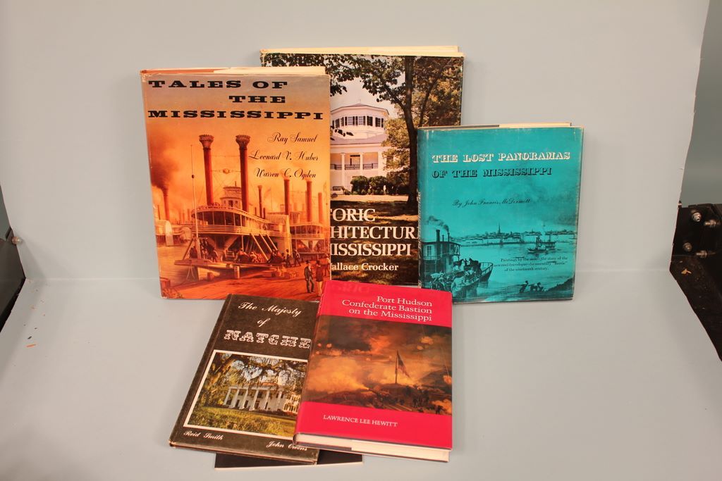 Group of Six Books On The History of Mississippi; including "Port Hudson Confederate Bastion on the Mississippi" by Lawrence Lee Hewitt; "The Lost Panoramas of the Mississippi" by John Frances McDermott; "The Majesty of Natchez" by Reid Smith and John Owens; "Mississippi the Magnolia State" a pamphlet published by Edwin Lloyd Smith Secretary of State; "Tales of The Mississippi" by Ray Samuel and "Historical Architecture in Mississippi" by Mary Wallace Cocker. Group of Six Books On The History of Mississippi; including "Port Hudson Confederate Bastion on the Mississippi" by Lawrence Lee Hewitt; "The Lost Panoramas of the Mississippi" by John Frances McDermott; "The Majesty of Natchez" by Reid Smith and John Owens; "Mississippi the Magnolia State" a pamphlet published by Edwin Lloyd Smith Secretary of State; "Tales of The Mississippi" by Ray Samuel and "Historical Architecture in Mississippi" by Mary Wallace Cocker.