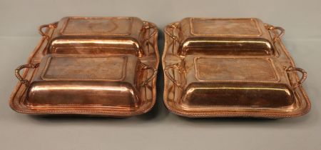 Two Silverplate Covered Casseroles, Pair crescent plate silver covered two handle casseroles. 12" w., 9" h., 2" deep Two Silverplate Covered Casseroles, Pair crescent plate silver covered two handle casseroles. 12" w., 9" h., 2" deep