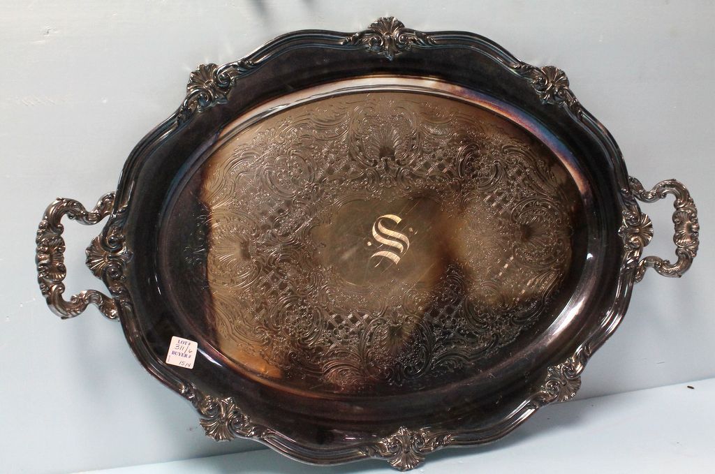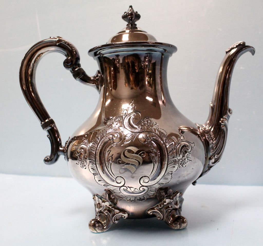 Six piece Reed and Barton "Regent" tea set consisting of coffee, teapot, sugar, creamer, open sugar and large tray. Tray 26" (Monogram S) Six piece Reed and Barton "Regent" tea set consisting of coffee, teapot, sugar, creamer, open sugar and large tray. Tray 26" (Monogram S)