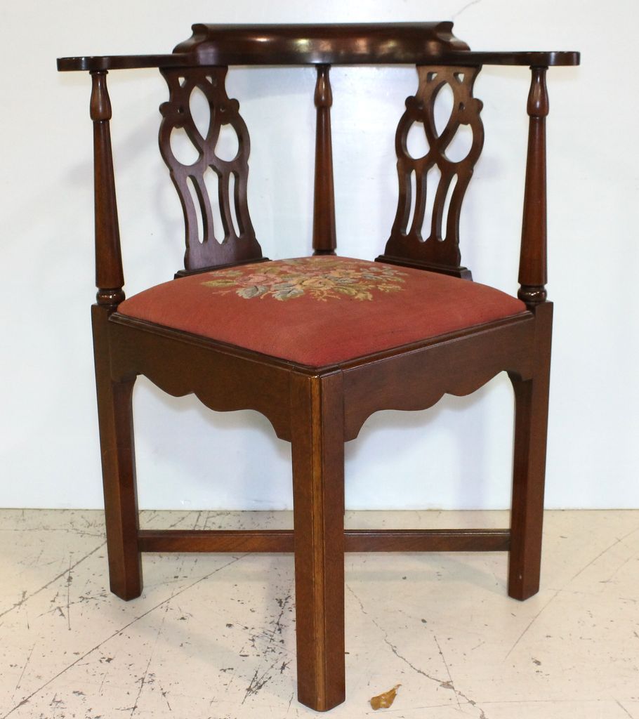 Chinese Chippendale corner chair with needlepoint seat.; 27 1/2" w., 33" h. Chinese Chippendale corner chair with needlepoint seat.; 27 1/2" w., 33" h.