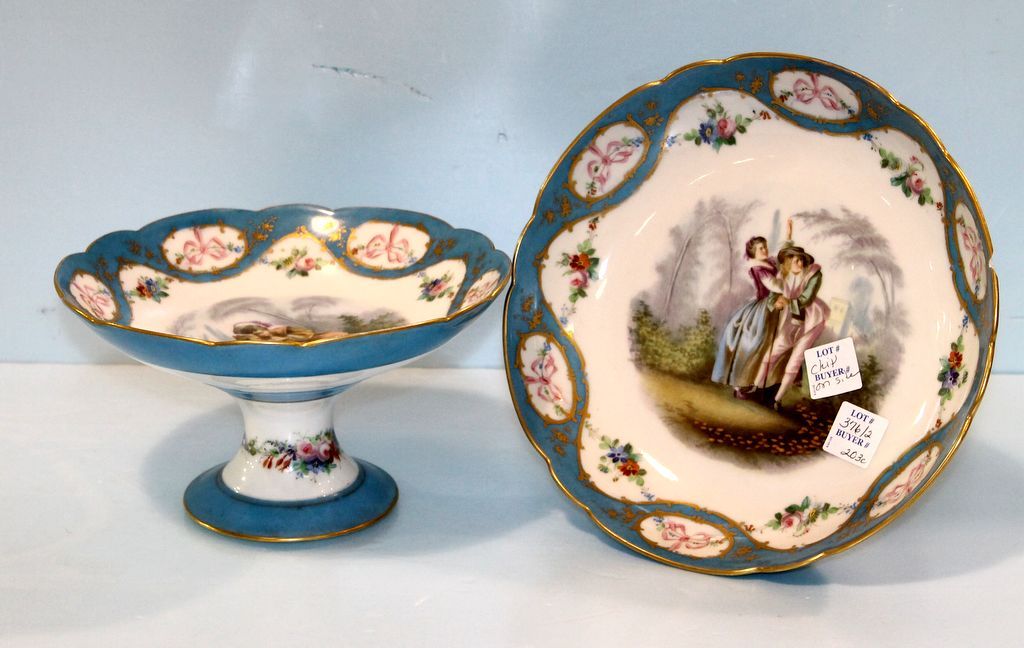 Beautiful hand painted blue serves compote.; 9 1/2" dia., 5 1/4" h. Compote has chip on side, Chateau de J. Bleau mark, also 8 1/2" dia., 5" h. compote with same mark Beautiful hand painted blue serves compote.; 9 1/2" dia., 5 1/4" h. Compote has chip on side, Chateau de J. Bleau mark, also 8 1/2" dia., 5" h. compote with same mark