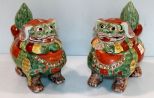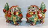 Pair of hand painted porcelain foo dogs. One has chips on front; 9" w., 8" h. Pair of hand painted porcelain foo dogs. One has chips on front; 9" w., 8" h.