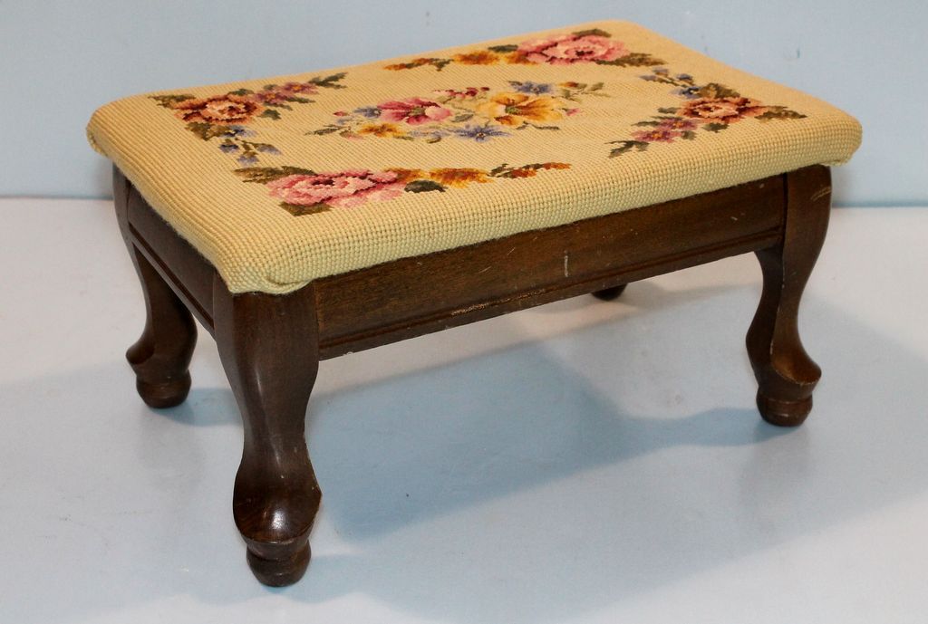 Small Queen Ann style footstool with needlepoint top.; 14" w., 9" d., 7" h. Small Queen Ann style footstool with needlepoint top.; 14" w., 9" d., 7" h.