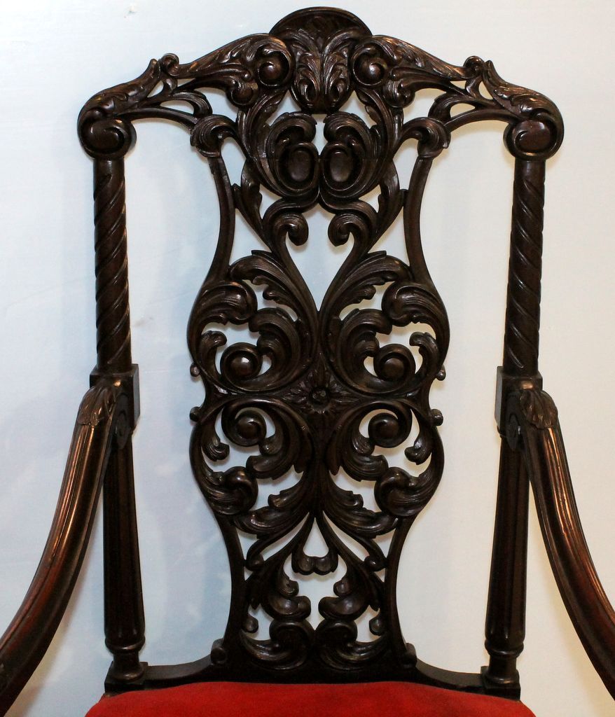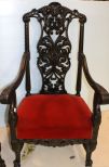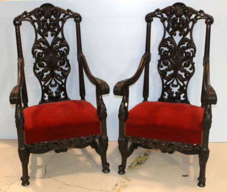 Par of heavily carved high back Rosewood arm chairs; Matches following lot, 48" h. Par of heavily carved high back Rosewood arm chairs; Matches following lot, 48" h.