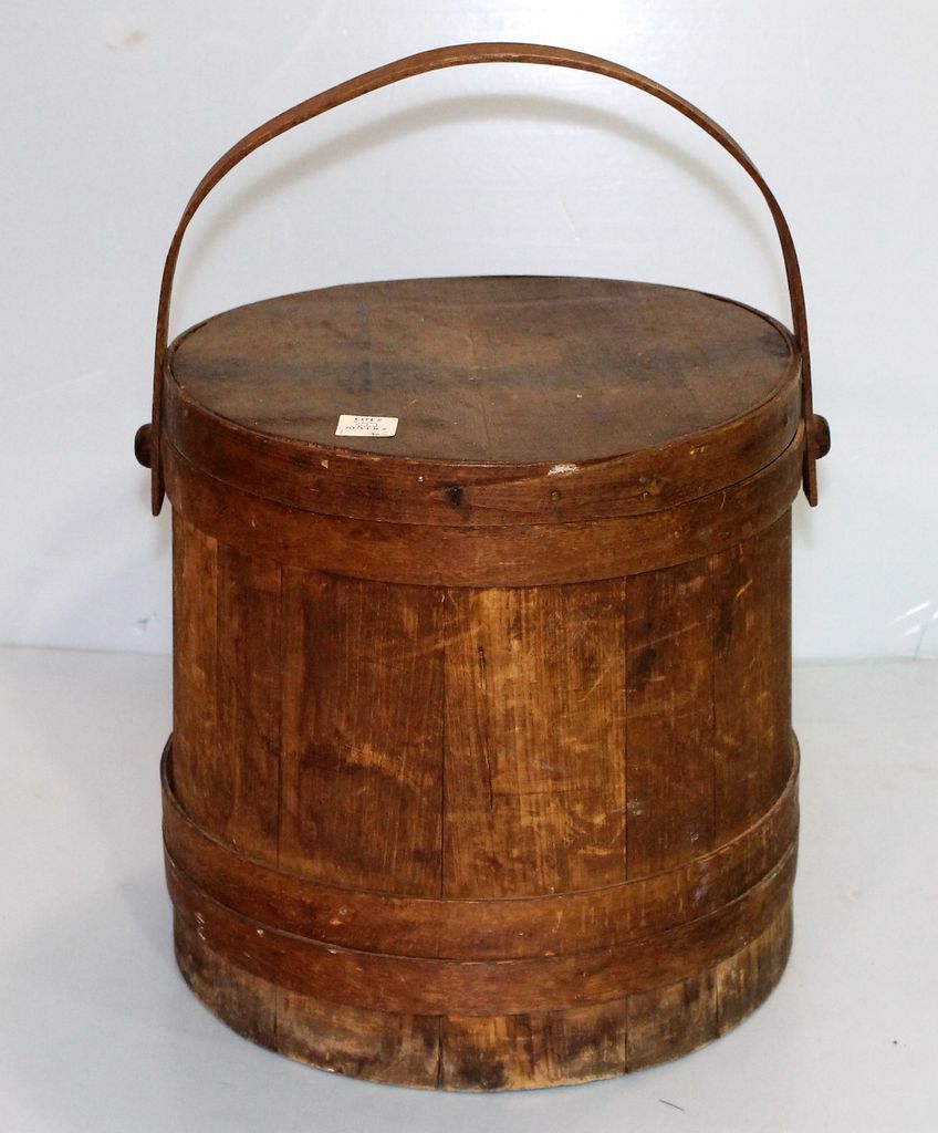 Early lift lid sugar bucket.; 12" dia., 12" h. Early lift lid sugar bucket.; 12" dia., 12" h.