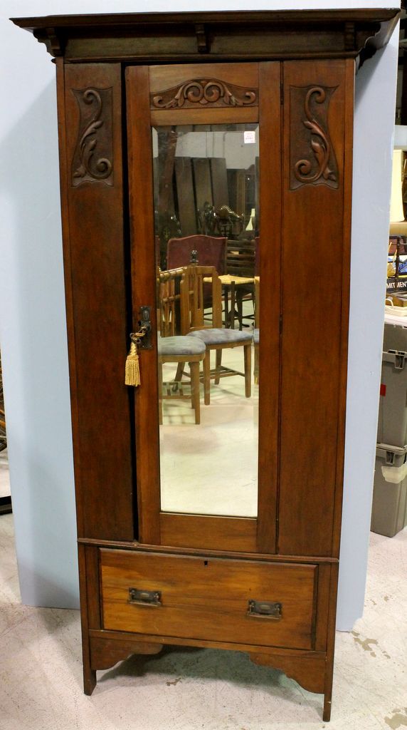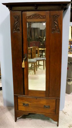 English art nouveaux single door armoire with center beveled glass door over drawer.; 29 1/2" w., 19" d., 75" h. English art nouveaux single door armoire with center beveled glass door over drawer.; 29 1/2" w., 19" d., 75" h.