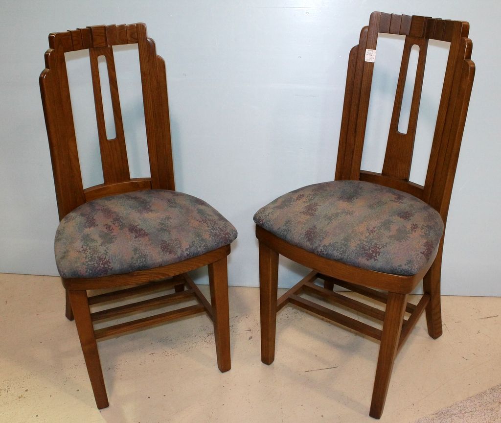 Pair of oak art deco side chairs.; 16 1/2" w., 14" d., 36" h. Pair of oak art deco side chairs.; 16 1/2" w., 14" d., 36" h.
