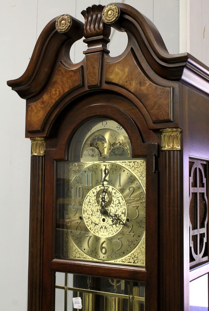 Trend grandfather clock by Sligh, Michigan based. Grandfather clock with self adjusting chimes, has key, brass face and trim on front door, capitol caps and rosettes.; 21" w., 14" d., 81 1/2" h. Trend grandfather clock by Sligh, Michigan based. Grandfather clock with self adjusting chimes, has key, brass face and trim on front door, capitol caps and rosettes.; 21" w., 14" d., 81 1/2" h.