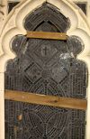 Gothic style stain glass window.; This window is in as is condition, needing lots of restoration (bowing, broken glass); 37 1/2" w., 5" d., 84" h. Gothic style stain glass window.; This window is in as is condition, needing lots of restoration (bowing, broken glass); 37 1/2" w., 5" d., 84" h.