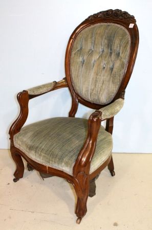 Victorian walnut gents parlor chair with rose carved crest, cabriolet legs and brass casters.; 23" w., 18" d., 39 1/2" h. Victorian walnut gents parlor chair with rose carved crest, cabriolet legs and brass casters.; 23" w., 18" d., 39 1/2" h.