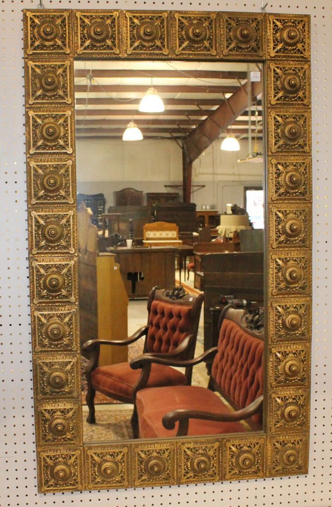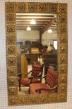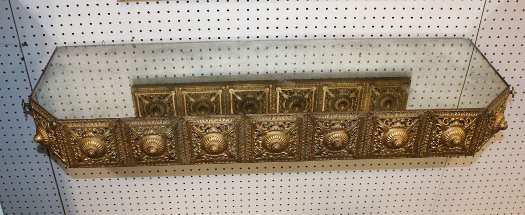 Elaborate Gold Metal and Wood Mirror with mirrored top base, 43"w., 15"d., 57"h. Elaborate Gold Metal and Wood Mirror with mirrored top base, 43"w., 15"d., 57"h.