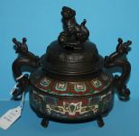 Bronze and Cloisonne Incense Burner with foo dog finial, 6"dia., 7"h. Bronze and Cloisonne Incense Burner with foo dog finial, 6"dia., 7"h.