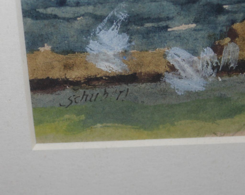 "River Landscape with House" watercolor signed Orlande Vincent Schubert (1844-1928), 10"w., 9"h. "River Landscape with House" watercolor signed Orlande Vincent Schubert (1844-1928), 10"w., 9"h.