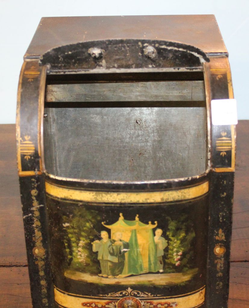 Chinoiserie design, cylinder door allspice canister, 9"w., 11"h. Chinoiserie design, cylinder door allspice canister, 9"w., 11"h.
