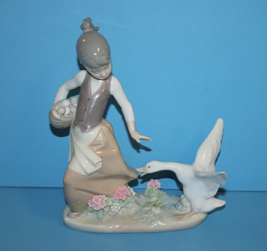 Lladro Figurine " Brillo" #1288 of young girl with aggressive goose, excellent condition, original box, 7"w., 8"h. Lladro Figurine " Brillo" #1288 of young girl with aggressive goose, excellent condition, original box, 7"w., 8"h.