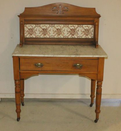 Marble top pine washstand, art nouveaux style with tile backsplash, 34"w., 18"d., 47"h. Marble top pine washstand, art nouveaux style with tile backsplash, 34"w., 18"d., 47"h.