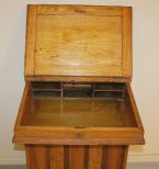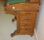 English walnut and oak davenport desk, slant lid, four drawers on the side, carved oak leaf gallery, felt insert, 21"w., 21"d., 34"h. English walnut and oak davenport desk, slant lid, four drawers on the side, carved oak leaf gallery, felt insert, 21"w., 21"d., 34"h.