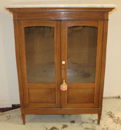Marble Top English two glass door, inlay display cabinet, 40"w., 16"d., 52"h. Marble Top English two glass door, inlay display cabinet, 40"w., 16"d., 52"h.