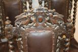 Late 19th Century set of five carved oak chairs, barley twist arms and legs. Has leather seats, crest with birds, most likely attributed to Alexander Roux, N.Y.18"w., 17"d., 43"h. Late 19th Century set of five carved oak chairs, barley twist arms and legs. Has leather seats, crest with birds, most likely attributed to Alexander Roux, N.Y.18"w., 17"d., 43"h.
