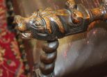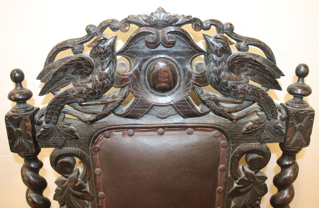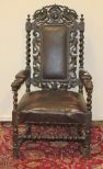 Late 19th Century carved oak barley twist arm chair with leather seat, carved bird crest, head on ends of arms, most likely attributed to Alexander Roux, N.Y. 24"w., 25"d., 48"h. Late 19th Century carved oak barley twist arm chair with leather seat, carved bird crest, head on ends of arms, most likely attributed to Alexander Roux, N.Y. 24"w., 25"d., 48"h.