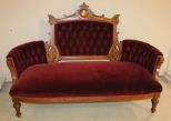 Walnut Eastlake settee in crimson velvet, tufted back and arms, burl walnut crest with center cartouche, 63"w., 24"d., 43"h. Walnut Eastlake settee in crimson velvet, tufted back and arms, burl walnut crest with center cartouche, 63"w., 24"d., 43"h.
