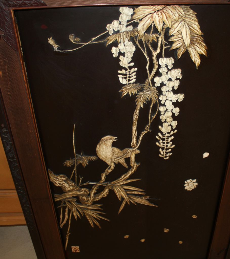 Japanese lacquer with ivory carving inlayed, Meiji period, circa: 1870-1890, carved flower and bird inlay, box wood framed, appraised by Oriental Arts, San Francisco, Cal, 1984 by member of international society of appraisers. Japanese lacquer with ivory carving inlayed, Meiji period, circa: 1870-1890, carved flower and bird inlay, box wood framed, appraised by Oriental Arts, San Francisco, Cal, 1984 by member of international society of appraisers.