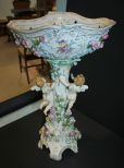 Marked in blue Dresden. Porcelain centerpiece with three cupids; no breaks, chips, or repairs; 12" dia., 18 1/2" h. Marked in blue Dresden. Porcelain centerpiece with three cupids; no breaks, chips, or repairs; 12" dia., 18 1/2" h.