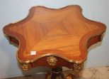 Inlaid scallop top table with elaborate bronze mounts; 24 1/2" w., 21" dia., 28" h. Inlaid scallop top table with elaborate bronze mounts; 24 1/2" w., 21" dia., 28" h.