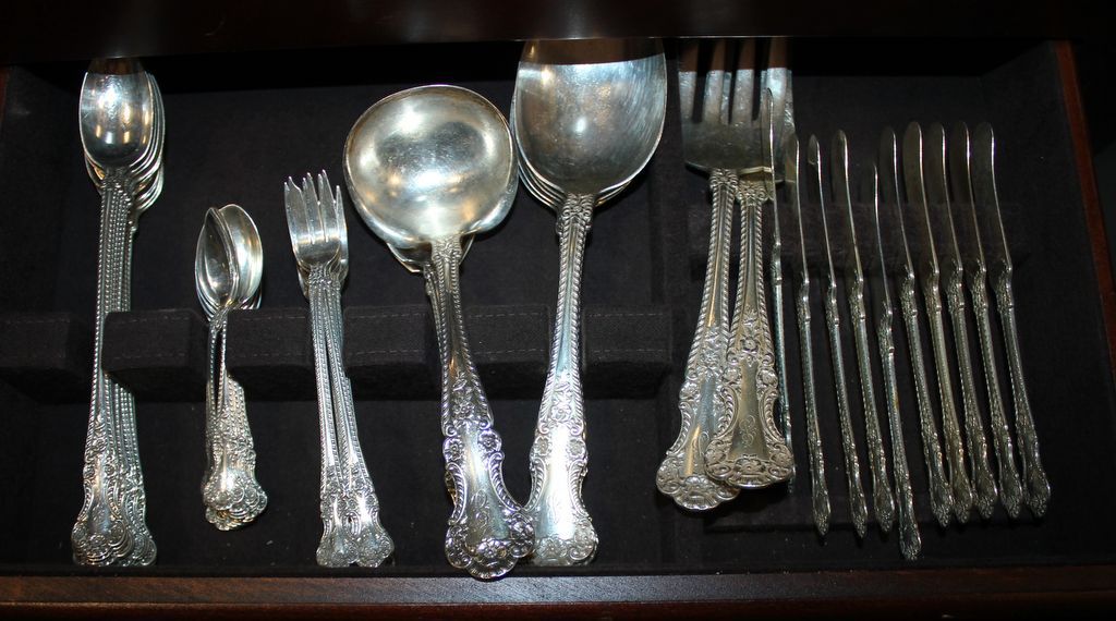 Set of "Cambridge" sterling flatware by Gorham. Set consists of twelve knives, twelve lunch forks, thirteen dinner forks, twelve salad forks, twelve bouillon spoons, twelve tablespoons, twenty-four teaspoons, twelve ice spoons, twelve demitasse spoons, twelve cocktail forks, ten butter knives, six large serving spoons, one berry spoon, one jelly spoon, one pie server, one gravy ladle, two different sizes of cold meat forks, and carving knife and fork (carving set is not marked sterling), monogrammed; 157 total pieces Set of "Cambridge" sterling flatware by Gorham. Set consists of twelve knives, twelve lunch forks, thirteen dinner forks, twelve salad forks, twelve bouillon spoons, twelve tablespoons, twenty-four teaspoons, twelve ice spoons, twelve demitasse spoons, twelve cocktail forks, ten butter knives, six large serving spoons, one berry spoon, one jelly spoon, one pie server, one gravy ladle, two different sizes of cold meat forks, and carving knife and fork (carving set is not marked sterling), monogrammed; 157 total pieces
