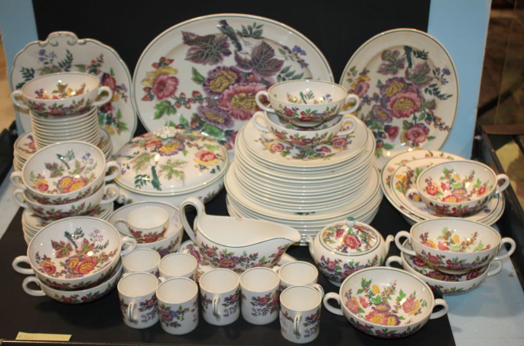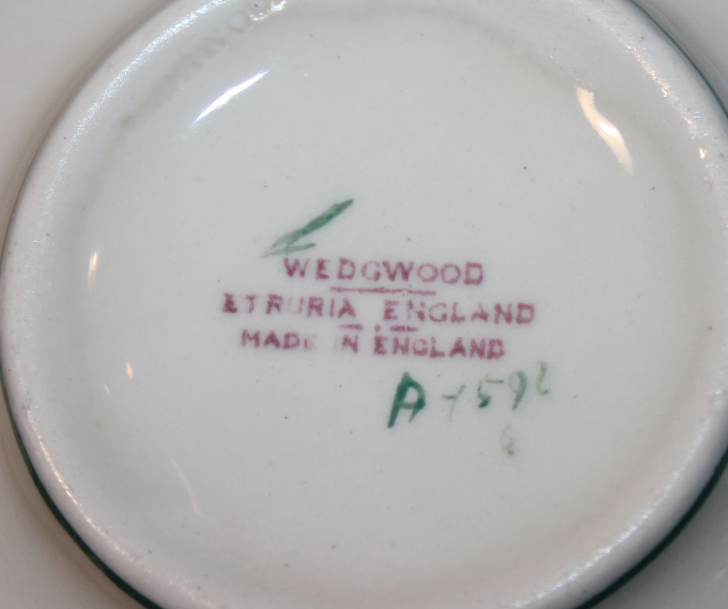 Wedgewood "Etruria" pattern consisting of eighty-seven pieces total; includes eight 10 1/4" dinner plates, ten 9 1/4" plates (two chipped), three 8 1/4" plates, five 7" plates (one chipped), nine 6 5/8" saucers, twelve 5 1/2" plates, eleven 4 1/2" saucers, eleven bouillon bowls, one gravy boat, one sugar bowl, nine demitasse cups ( eight one size, one another size) (one cup chipped), one 4 7/8" cereal bowl, two open vegetable bowls, one 14 1/2" platter, one 10 5/8" platter, one cake plate, one covered tureen Wedgewood "Etruria" pattern consisting of eighty-seven pieces total; includes eight 10 1/4" dinner plates, ten 9 1/4" plates (two chipped), three 8 1/4" plates, five 7" plates (one chipped), nine 6 5/8" saucers, twelve 5 1/2" plates, eleven 4 1/2" saucers, eleven bouillon bowls, one gravy boat, one sugar bowl, nine demitasse cups ( eight one size, one another size) (one cup chipped), one 4 7/8" cereal bowl, two open vegetable bowls, one 14 1/2" platter, one 10 5/8" platter, one cake plate, one covered tureen