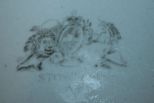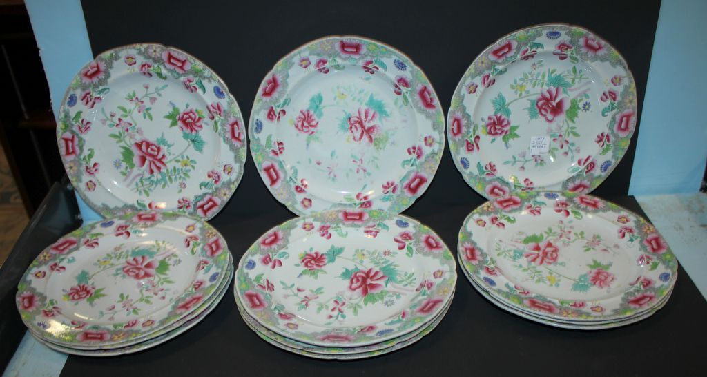 Twelve stone china dinner plates with Chinese design; one plate with chip on rim, one broken and repaired, and one with old hairline cracks on back Twelve stone china dinner plates with Chinese design; one plate with chip on rim, one broken and repaired, and one with old hairline cracks on back