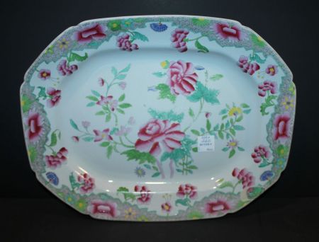 Large stone china platter (matches previous lot) repaired on right side; 15" w. Large stone china platter (matches previous lot) repaired on right side; 15" w.