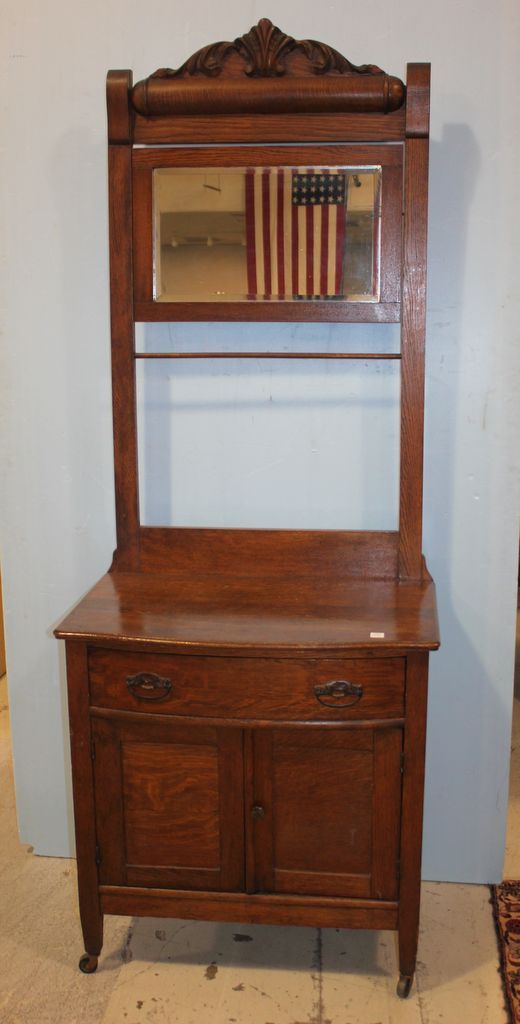 Oak washstand with beveled mirror, singe drawer, and doors, matches lot #264 and 347; 29 1/2" w., 17" dia., 79" h. Oak washstand with beveled mirror, singe drawer, and doors, matches lot #264 and 347; 29 1/2" w., 17" dia., 79" h.