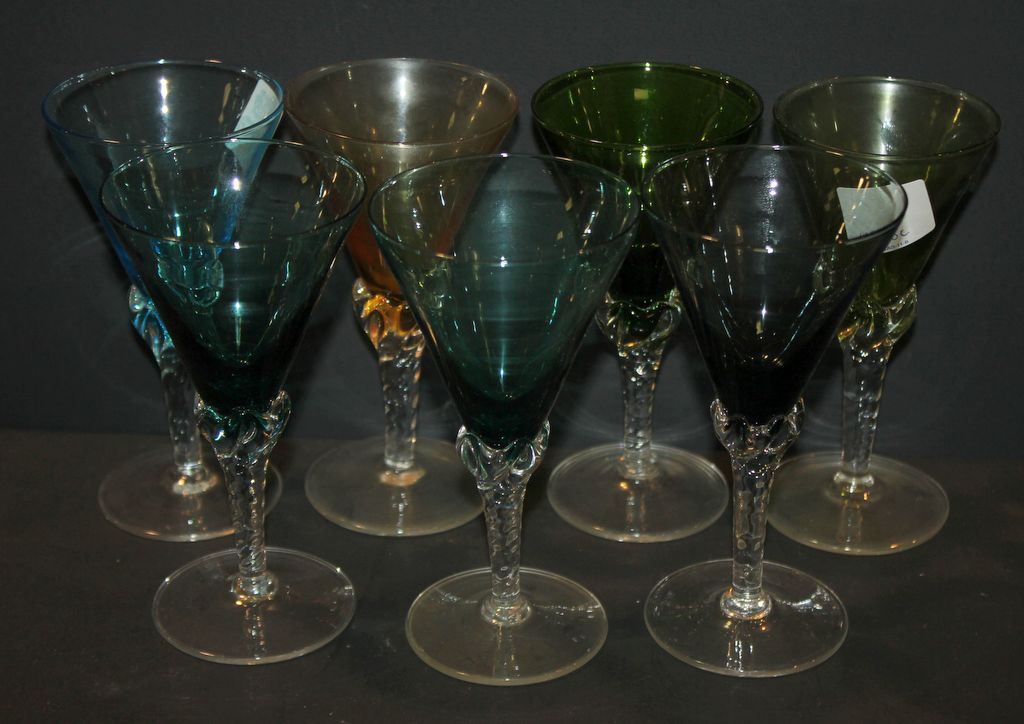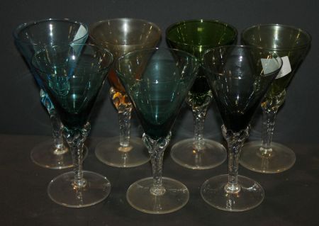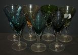 Set of seven various colored wine glasses; 5 1/2" h. Set of seven various colored wine glasses; 5 1/2" h.