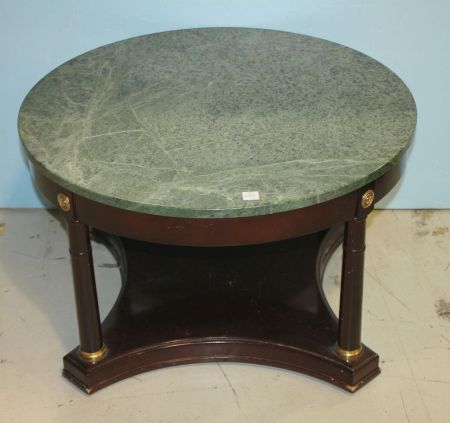 Green marble top coffee table with columns, brass mounts; 29" dia., 18" h. Green marble top coffee table with columns, brass mounts; 29" dia., 18" h.