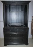 Painted black, two door, four drawer entertainment center. 36" w., 28" dia., 85" h. Painted black, two door, four drawer entertainment center. 36" w., 28" dia., 85" h.
