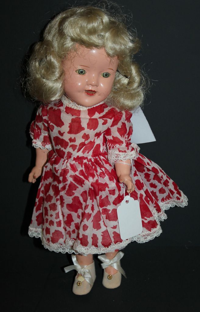 Rare composition Shirley Temple doll, not the original dress, not sure about the wig. This is a rare size. Stamp on back. 11" h. Rare composition Shirley Temple doll, not the original dress, not sure about the wig. This is a rare size. Stamp on back. 11" h.
