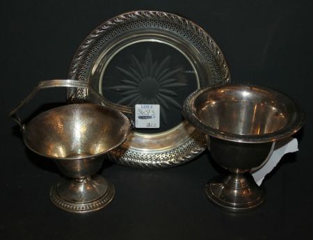 Large Amston sterling coaster (6" dia.), small sterling basket (4" dia., 5" h.) monogrammed C, International sterling dish Large Amston sterling coaster (6" dia.), small sterling basket (4" dia., 5" h.) monogrammed C, International sterling dish