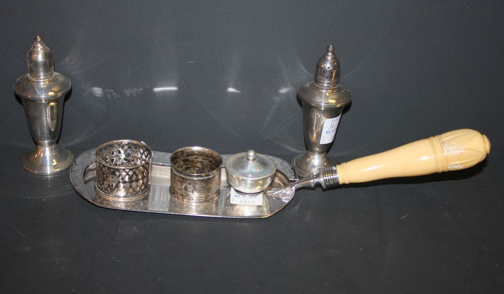 Which includes an English Sheffield plate crumber, silverplate napkin, sterling napkin ring, covered sterling salt, sterling weighted salt/pepper Which includes an English Sheffield plate crumber, silverplate napkin, sterling napkin ring, covered sterling salt, sterling weighted salt/pepper
